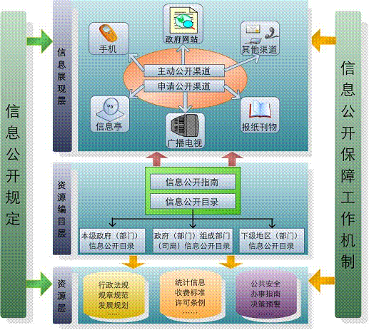 结合《中华人民共和国政府信息公开条例》的规定,以及政务公开信息化实现的层级关系,政务公开信息的信息化框架如下: