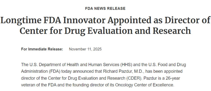 11月11日,美国卫生与公众服务部(HHS)正式公布了这项任命。FDA局长Marty Makary医学博士在公告中将Pazdur称为“著名的监管创新者”,肯定了他在医药审评与监管领域的卓越贡献。