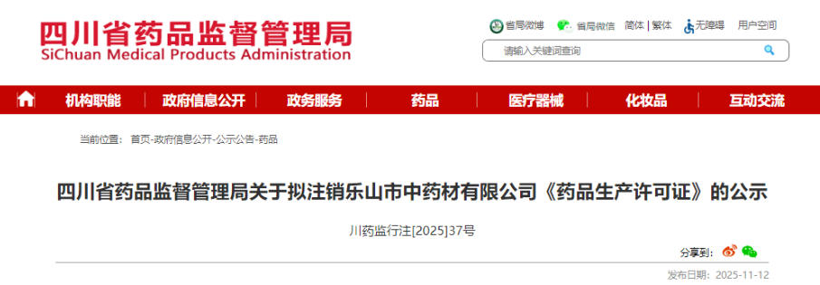 根据《药品生产监督管理办法》第二十条第一项规定,经企业申请,本机关拟注销乐山市中药材有限公司《药品生产许可证》,企业名称:乐山市中药材有限公司;许可证编号:川20160083;注册地址:乐山市市中区东大街87号;法定代表人:张荣杰;企业负责人:文屹兵;质量负责人:陈丽;生产负责人:文劲松;质量受权人:陈丽;生产地址和生产范围:四川省乐山市市中区大丛林巷319号:中药饮片(净制、切制、炒制、煅制、制炭、蒸制、煮制、炖制、燀制、酒炙、醋炙、盐炙、姜炙、蜜炙、煨制)***。