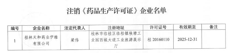 桂林天和药业伊维有限公司于近日向我局提交了《药品生产许可证》注销申请。