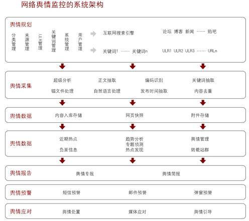 网络舆情系统利用互联网信息采集、智能信息处理技术(文本挖掘技术)和全文检索技术,对境内外网络中的新闻网页、论坛、博客、新闻评论,贴吧等网络资源进行精确采集、定向采集和智能分析,提供舆情信息检索、热点信息的发现、热点跟踪定位、敏感信息监控、辅助决策支持、舆情实时预警、舆情监管、统计分析等多层次、多维度的舆情信息的服务,实现用户的网络舆情监测和定向追踪等信息需求,形成简报、报告、图表等分析结果,从而帮助政府、企业及时掌握舆情动向,准确捕捉预警信息,对有较大影响的重要事件快速发现、快速处理,从正面引导舆论和宣传,构建积极向上的主流舆论,并为政府、企业决策提供信息依据。实现对舆情分析提出的目标。