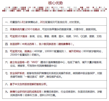 技术领先:融合了数据挖掘技术、数据库技术、搜索引擎技术、网络舆情分析引擎技术以及多项自然语言智能处理技术等